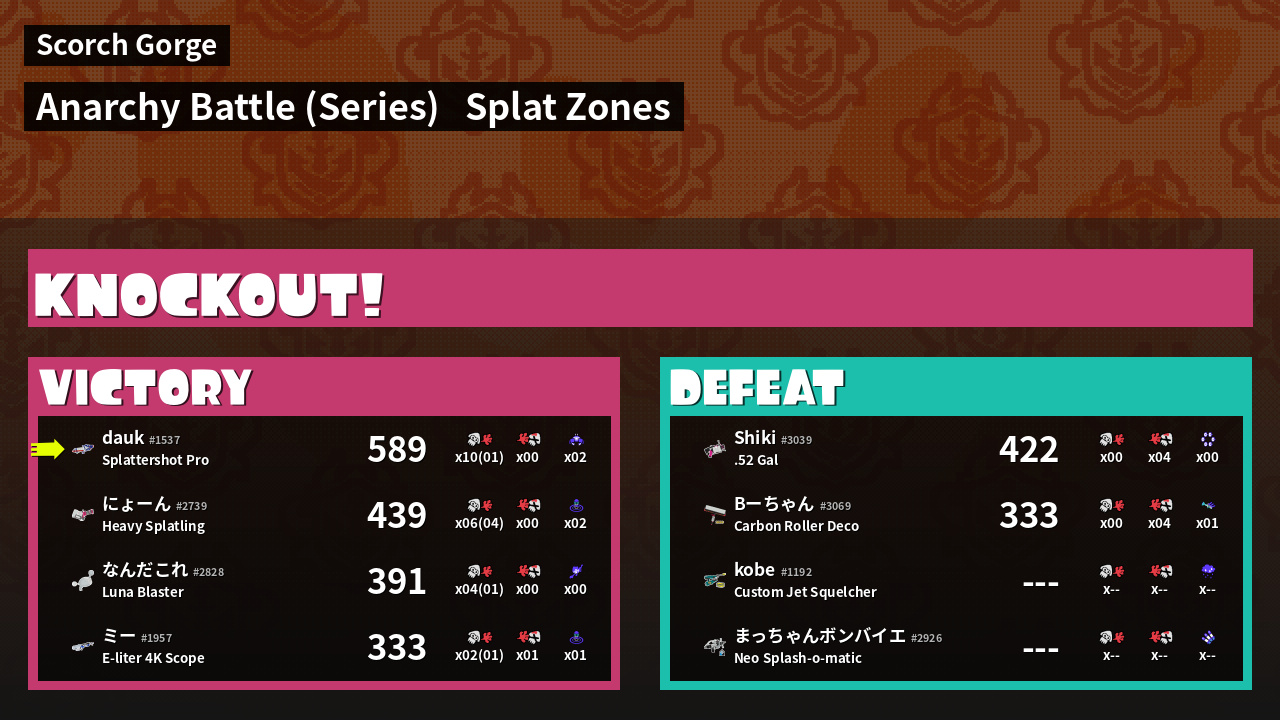 | 激レアの天然記念物 dauk #1537 |  Splattershot Pro                    | 589 | 9 + 1 | 0 | 99.99 |  2 | |