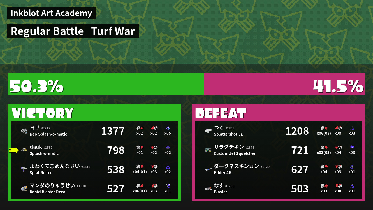 | Medals | #1 Enemy-Base Inker #1 Super Jump Spot #1 Ink Consumer | ||