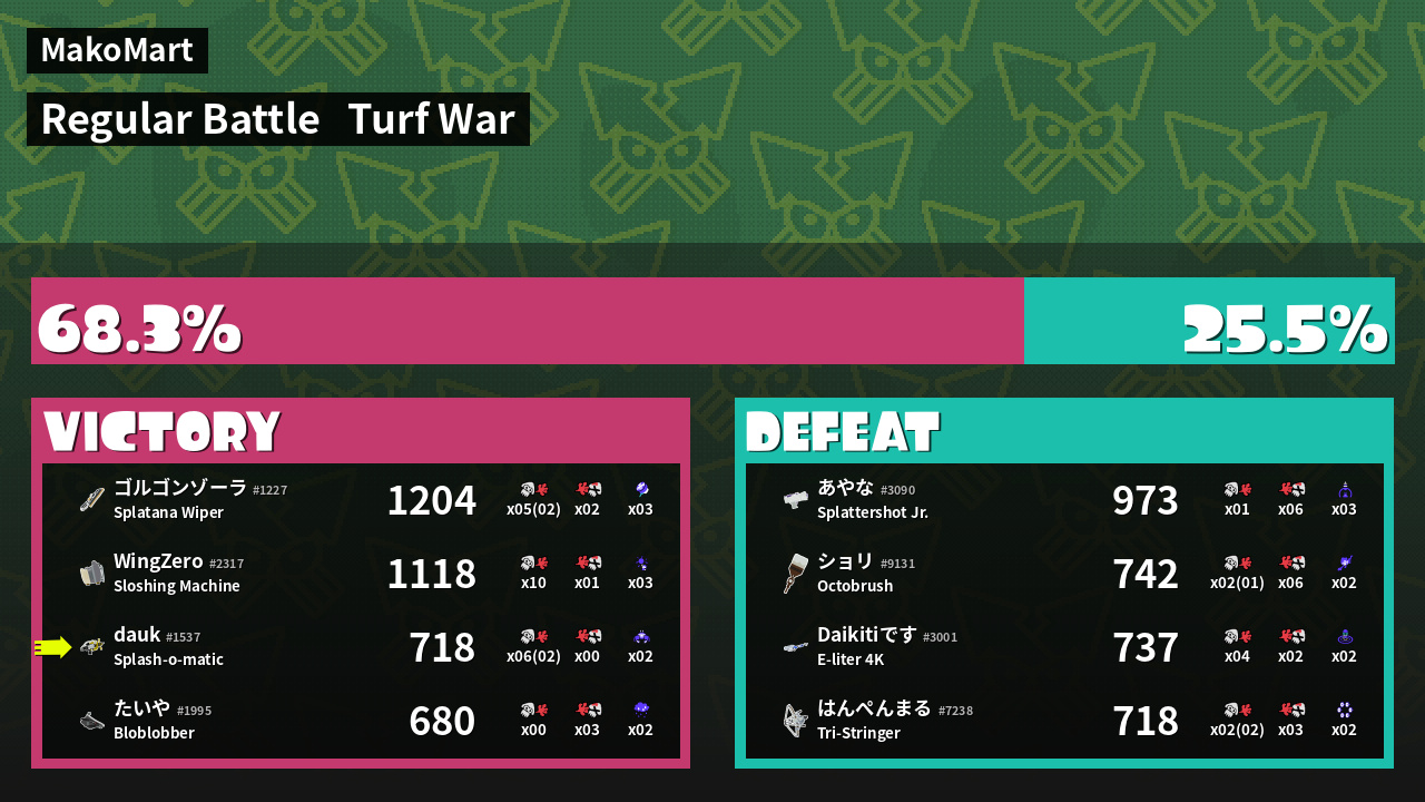 | Medals | #1 Splat Assister #1 Base Defender #1 Ink Consumer | ||