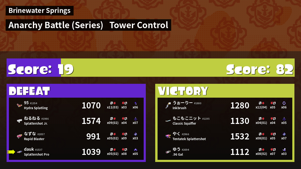 | Medals | #1 Crab Tank User #2 Splat Assister | ||