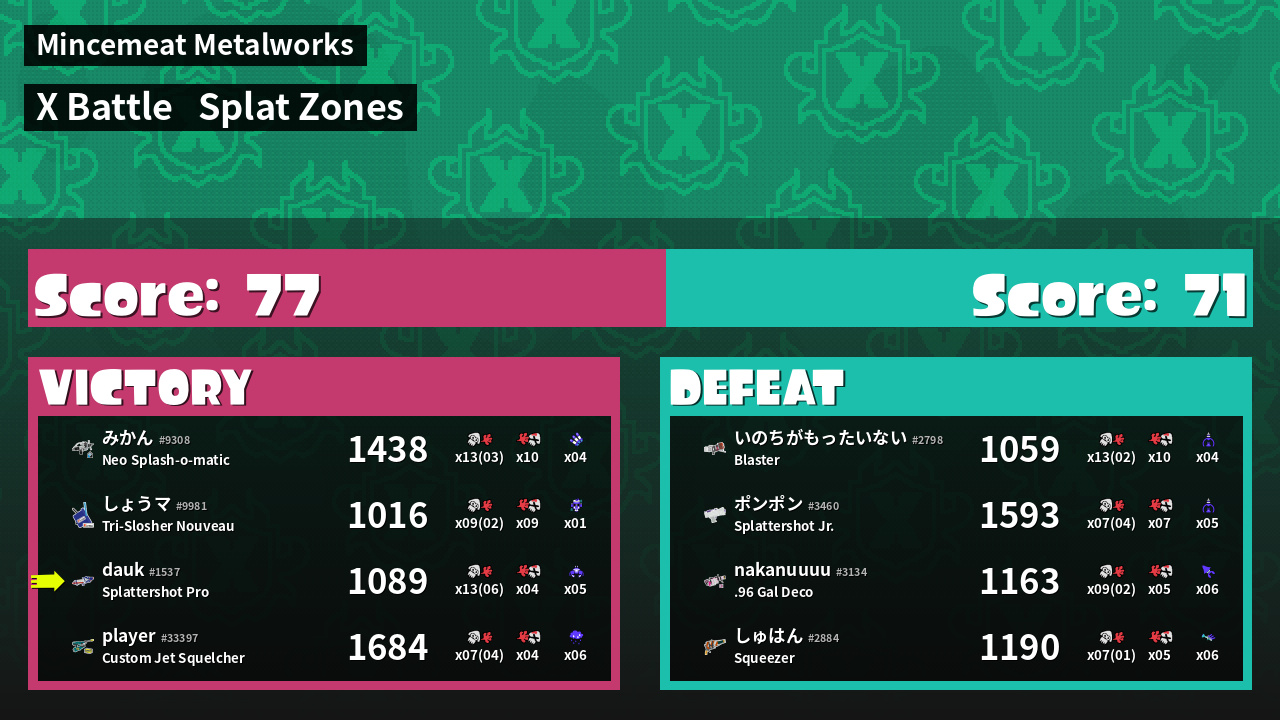 | Medals | #1 Overall Splatter #1 Splat Assister #1 Damage Taker | ||