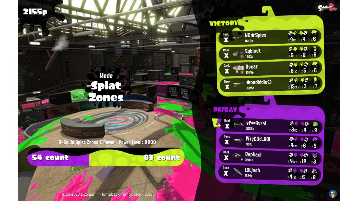 | Mode | Splat Zones - Ranked Battle | ||||||||||||||||
