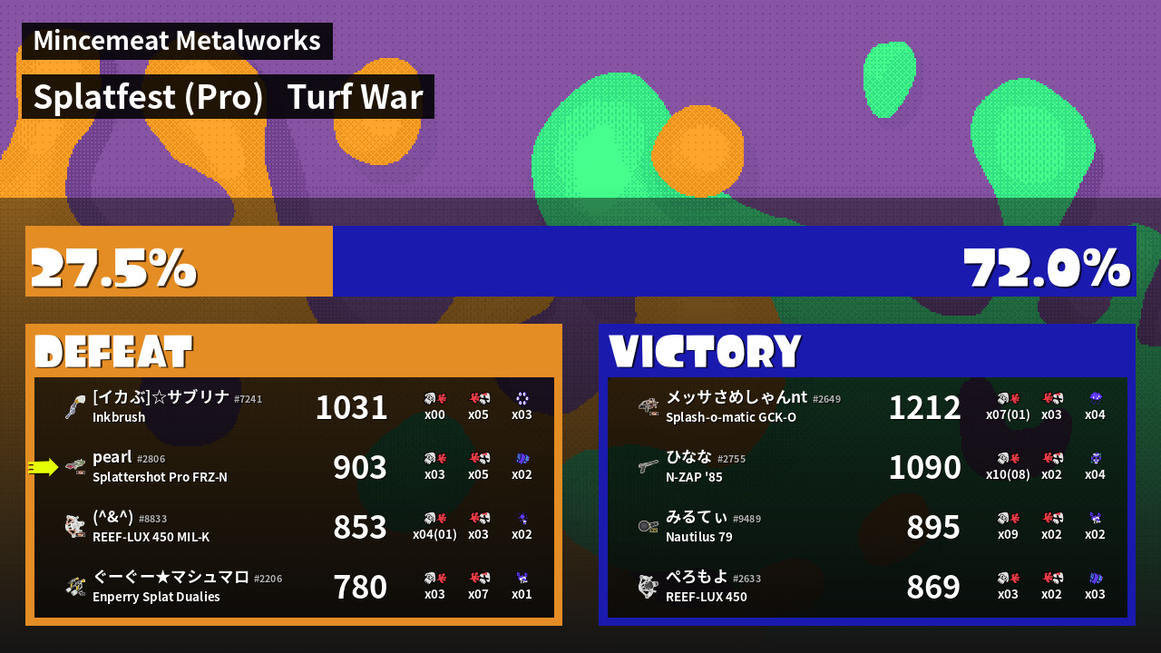 | エレガントな天然記念物  pearl #2806 |  Splattershot Pro FRZ-N                    | 903 | 3 + 0 | 5 | 0.60 |  2 | |
