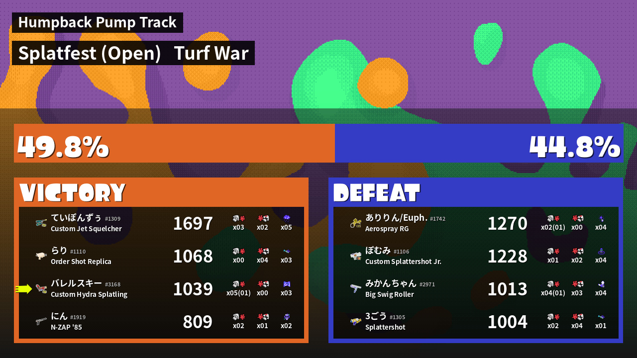 | Medals | #1 Overall Splatter #1 Enemy Splatter #1 Splat Assister | ||