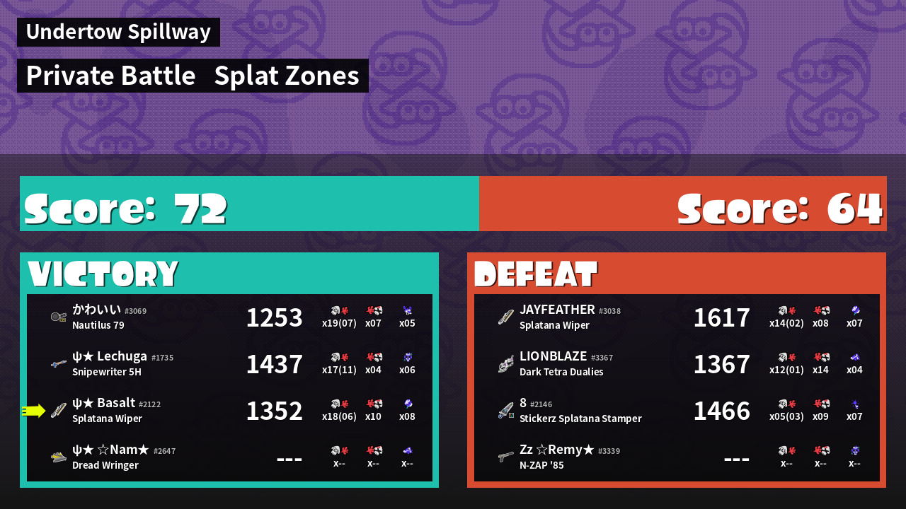 | Medals | #1 Splat Zone Guard #1 Enemy Splatter #1 Ground Traveler | ||