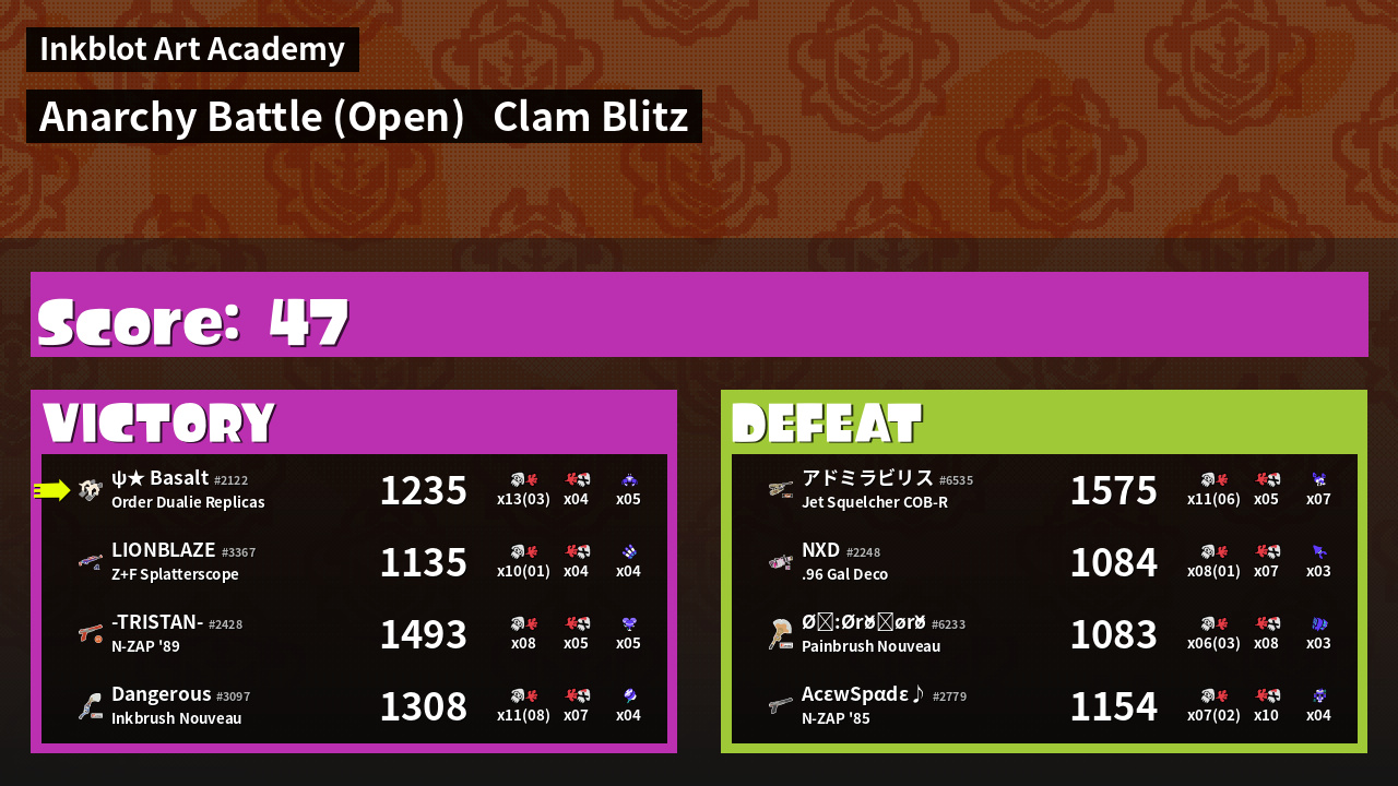 | Mode | Clam Blitz - Anarchy Battle (Open) | ||