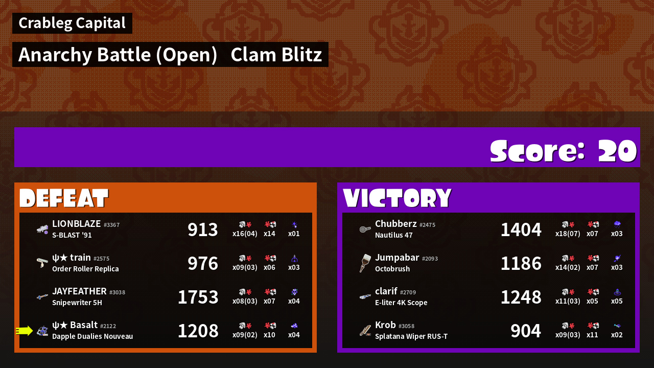 | Mode | Clam Blitz - Anarchy Battle (Open) | ||