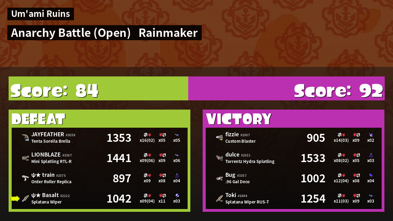 | Medals | #1 Rainmaker Stopper #1 Ultra Stamp User #2 Overall Splatter | ||