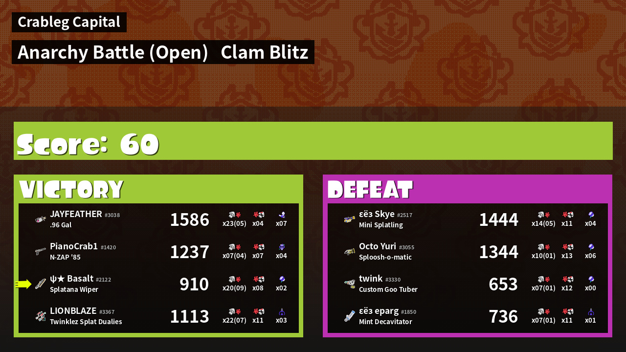| Mode | Clam Blitz - Anarchy Battle (Open) | ||