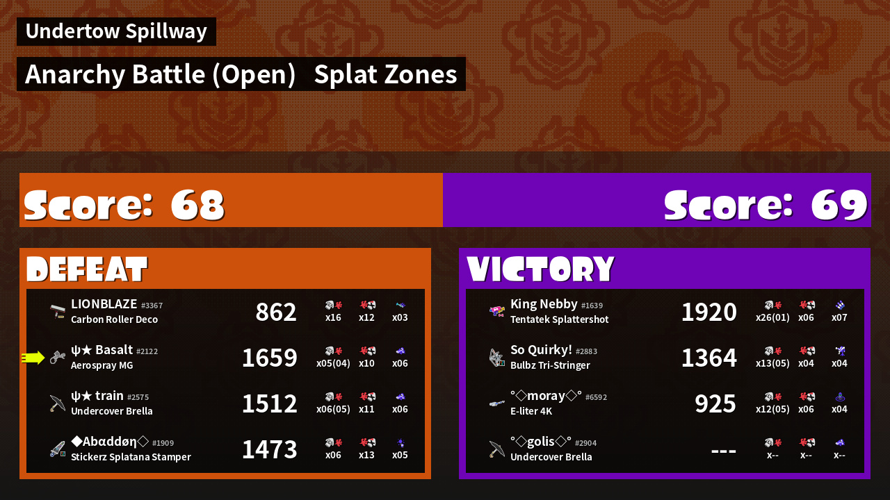 | Mode | Splat Zones - Anarchy Battle (Open) | ||