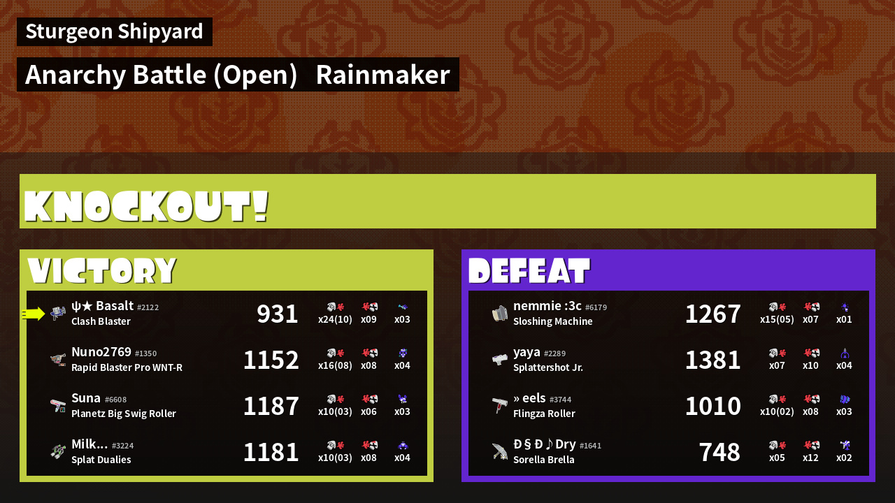 | Medals | #1 Overall Splatter #1 Enemy Splatter #1 Splat Assister | ||
