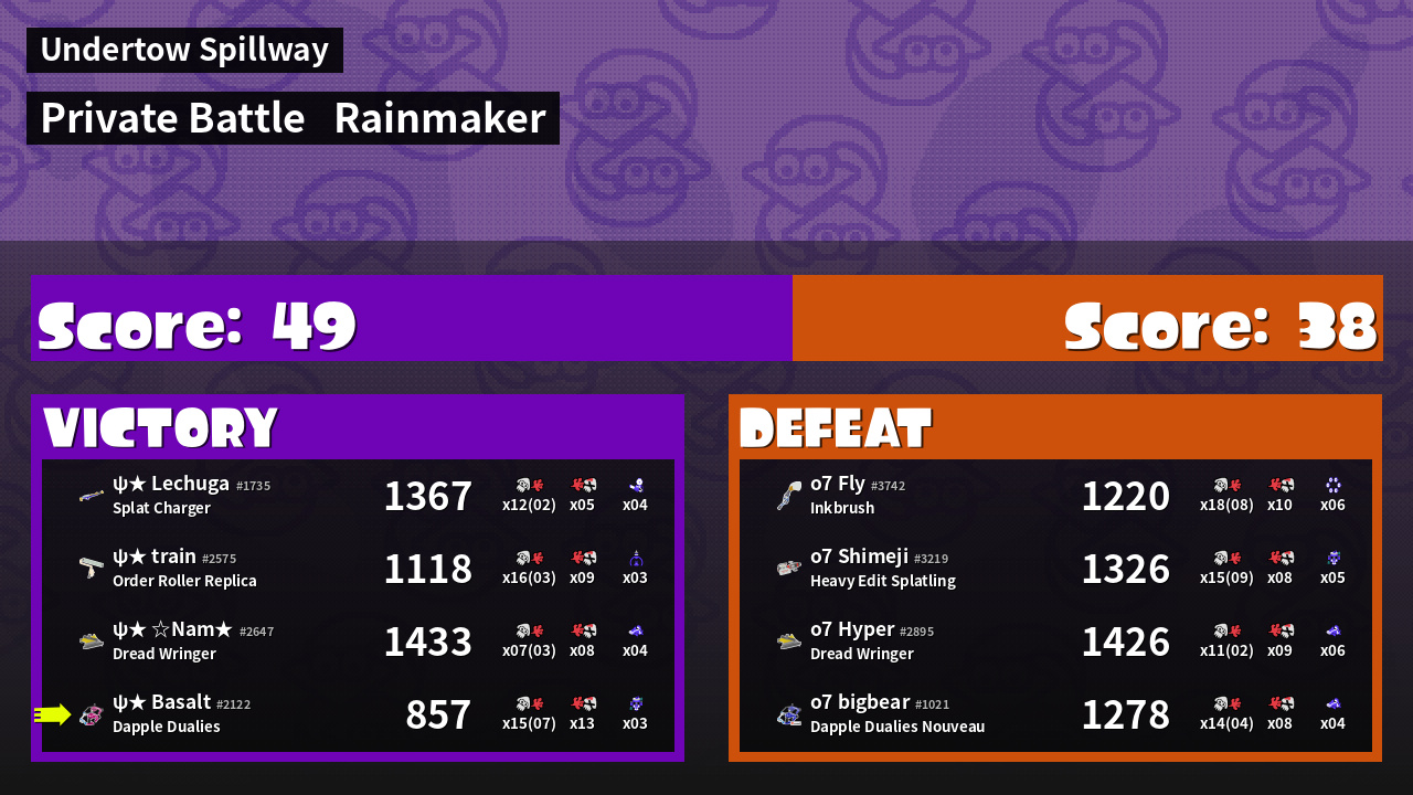 | Medals | #1 Splat Assister #1 Rainmaker Stopper #1 Tacticooler User | ||