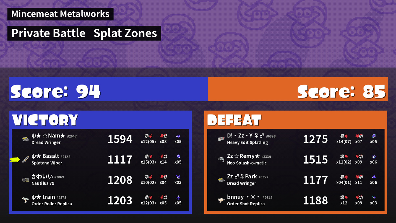 | Mode | Splat Zones - Private Battle | ||