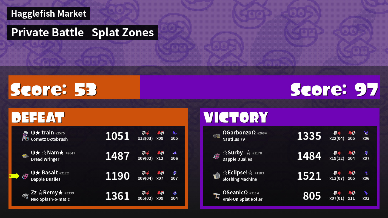 | Mode | Splat Zones - Private Battle | ||
