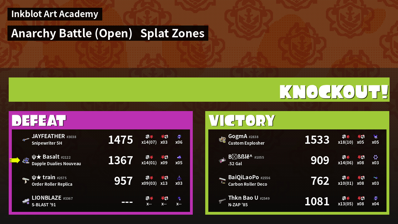 | Mode | Splat Zones - Anarchy Battle (Open) | ||