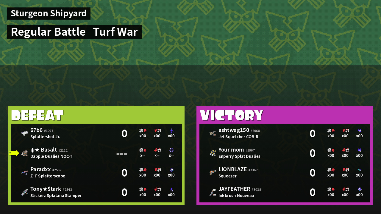 | Weapon | Dapple Dualies NOC-T ( Splat Bomb / Killer Wail 5.1) | ||