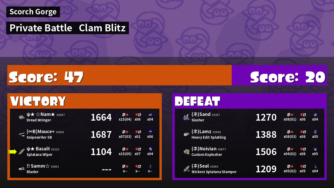 | Medals | #1 Overall Splatter #1 Splat Assister #1 Clam Stopper | ||