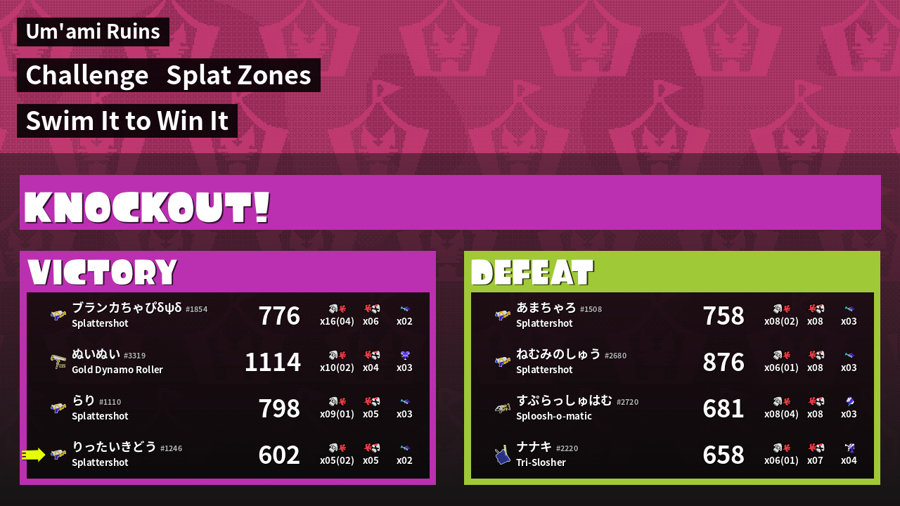 | Medals | #1 Splat Zone Hero #1 Ground Traveler #1 Trizooka User | ||