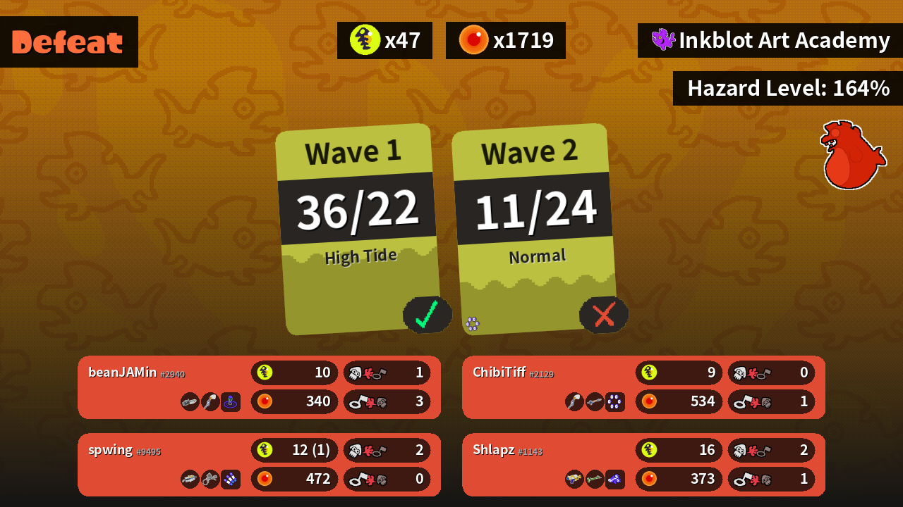 | Weapons | Ballpoint Splatling Inkbrush | Splattershot Bamboozler 14 Mk I | Grizzco Brella Aerospray MG | Inkbrush Snipewriter 5H |
