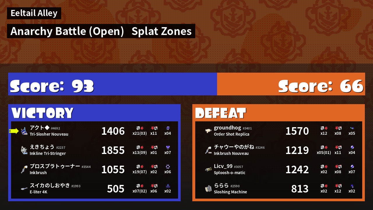 | Mode | Splat Zones - Anarchy Battle (Open) |
