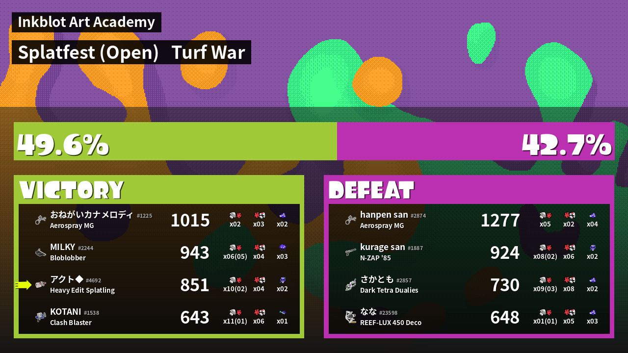 | Medals | #1 Super Jump Spot #2 Overall Splatter #2 Enemy Splatter |
