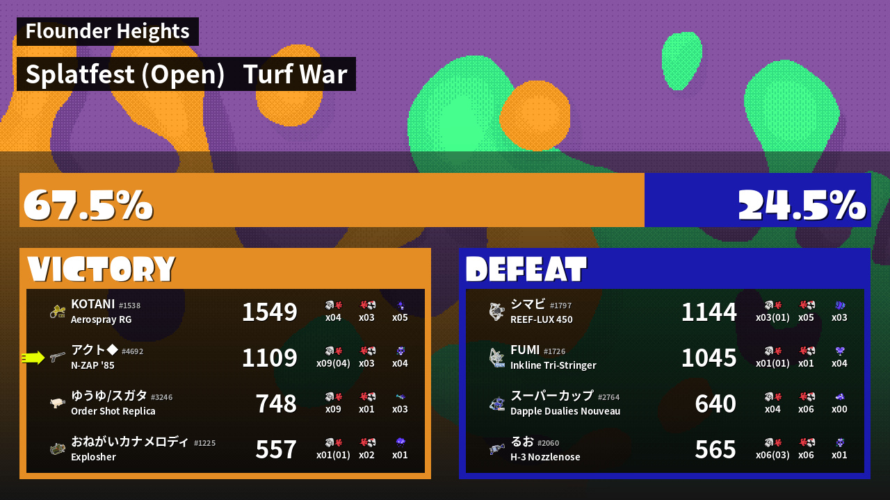 | Medals | #1 Overall Splatter #1 Splat Assister #1 Ground Traveler |
