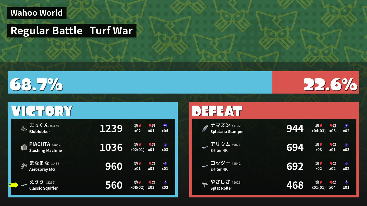 Kills / Deaths | 6 + 2 / 3 > Kill Ratio: 2.00 | ||