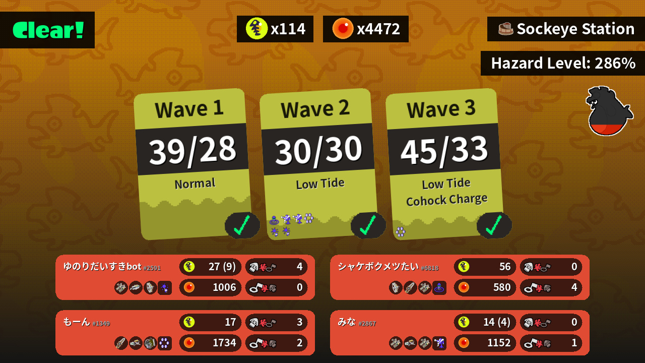 | Weapons | Grizzco Dualies Grizzco Brella Grizzco Stringer | Grizzco Stringer Grizzco Splatana Grizzco Dualies | Grizzco Splatana Grizzco Blaster Grizzco Slosher | Grizzco Dualies Grizzco Blaster Grizzco Dualies |