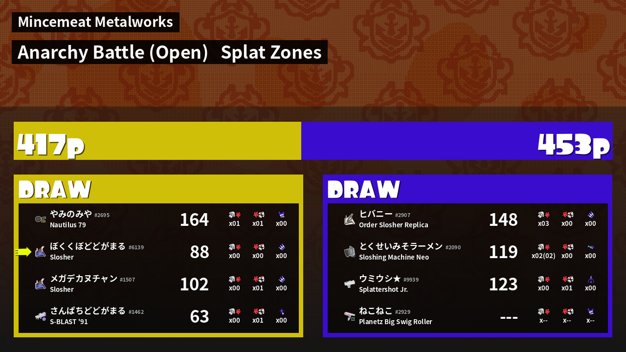 | Mode | Splat Zones - Anarchy Battle (Open) |