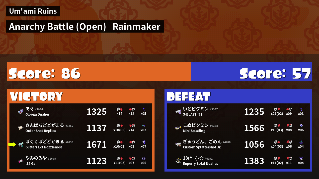 | Mode | Rainmaker - Anarchy Battle (Open) |