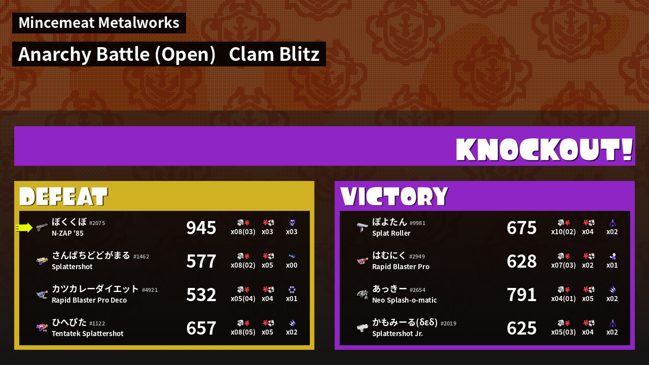 | Mode | Clam Blitz - Anarchy Battle (Open) | ||