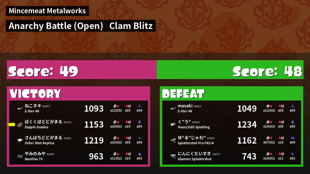 | Mode | Clam Blitz - Anarchy Battle (Open) |