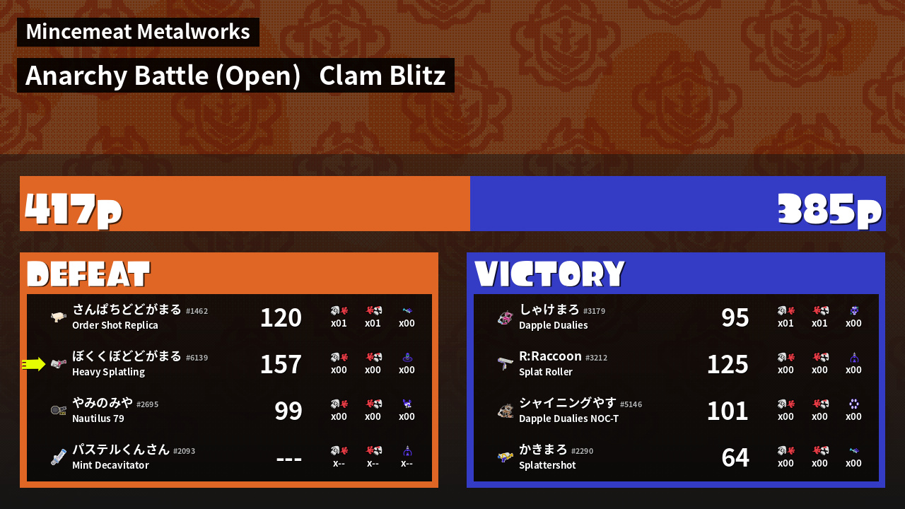 | Mode | Clam Blitz - Anarchy Battle (Open) |