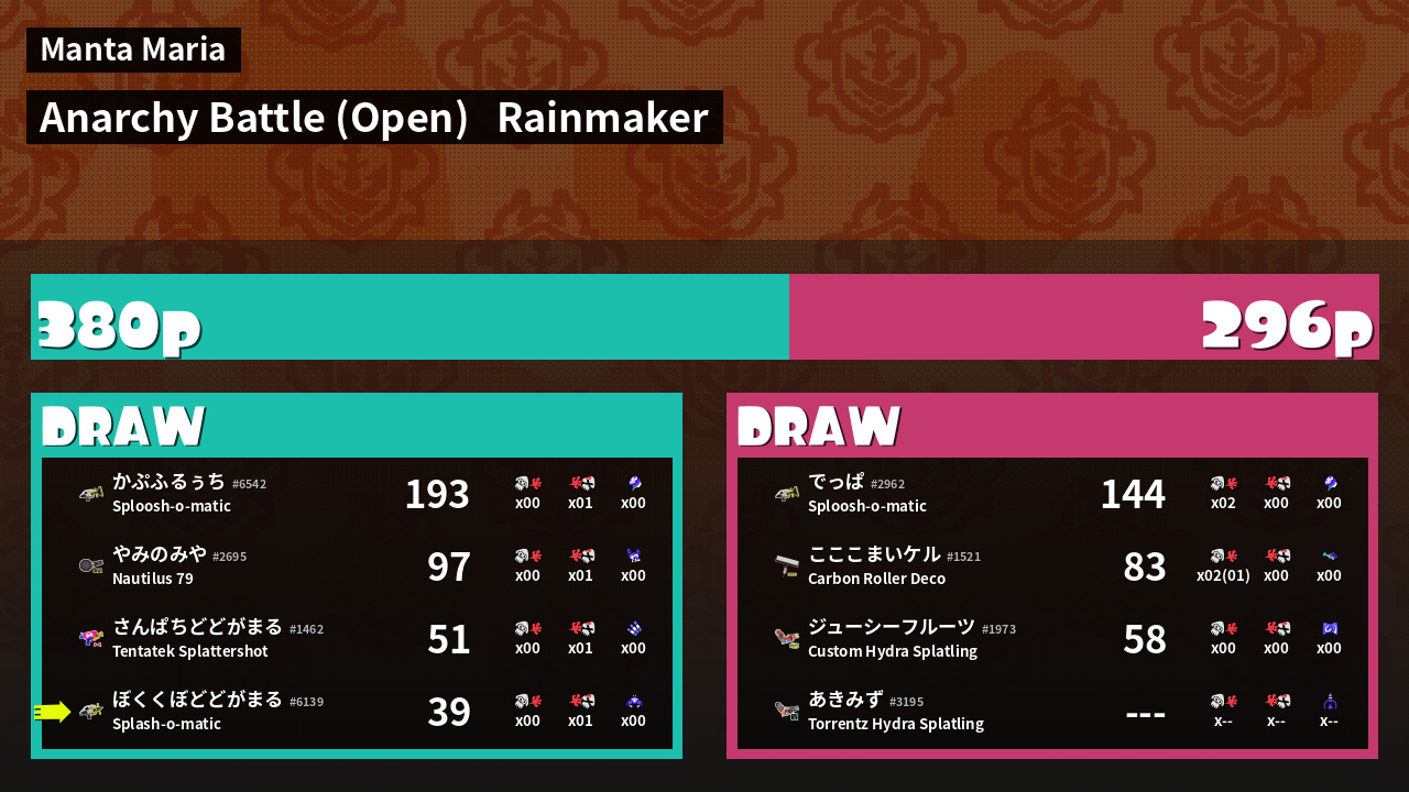 | Mode | Rainmaker - Anarchy Battle (Open) |