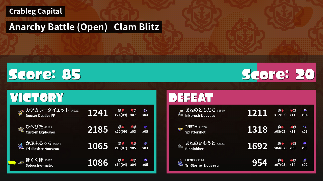 | Mode | Clam Blitz - Anarchy Battle (Open) | ||