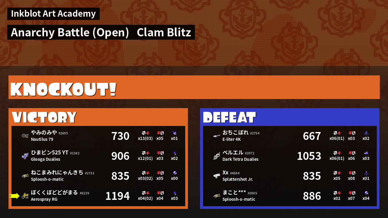 | Mode | Clam Blitz - Anarchy Battle (Open) |