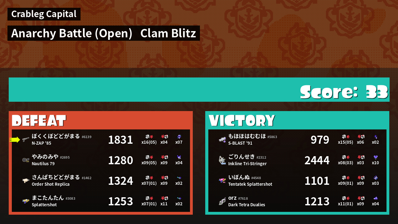 | Mode | Clam Blitz - Anarchy Battle (Open) |