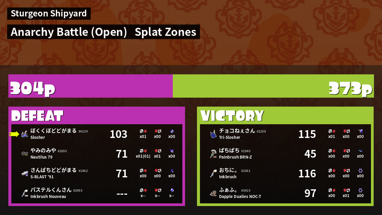 | Mode | Splat Zones - Anarchy Battle (Open) |