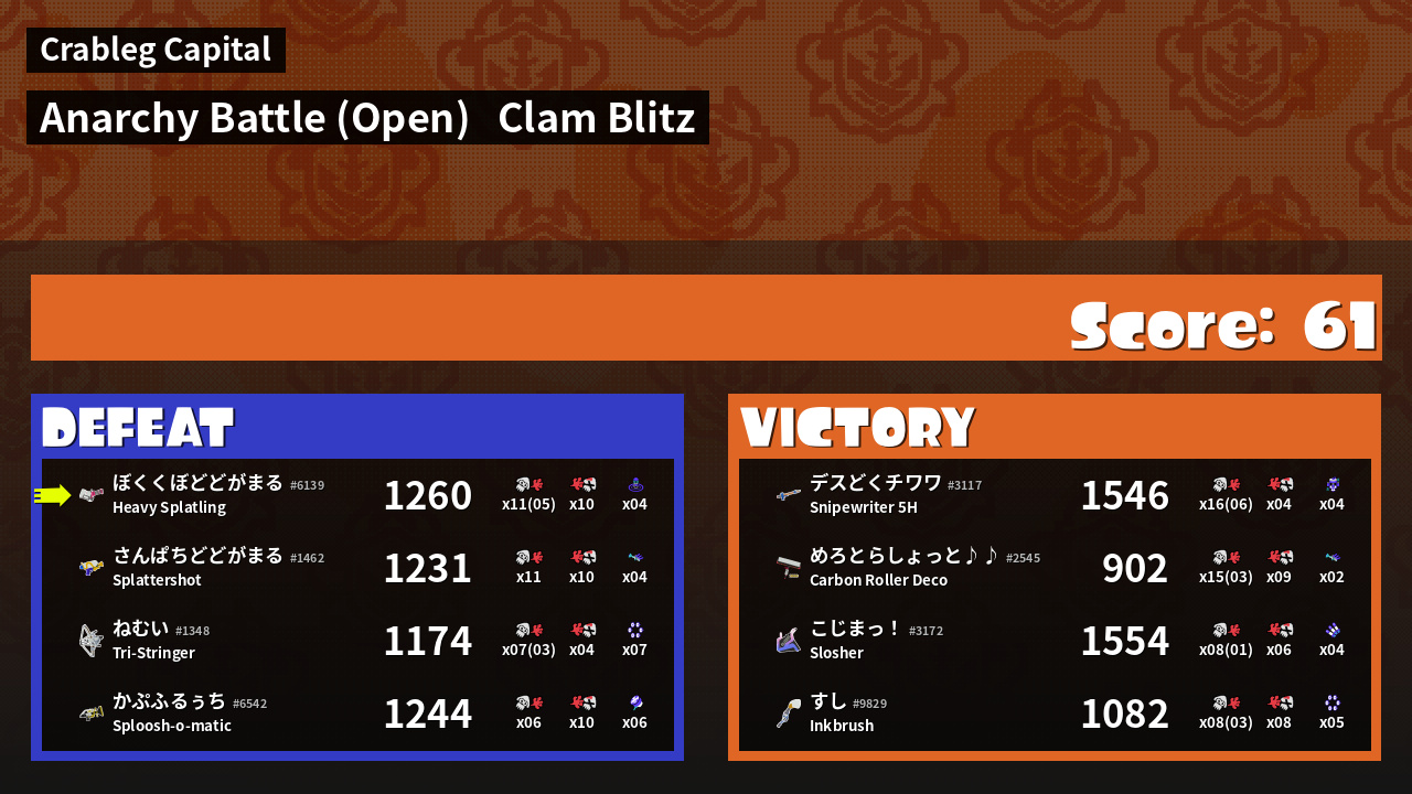 | Mode | Clam Blitz - Anarchy Battle (Open) |