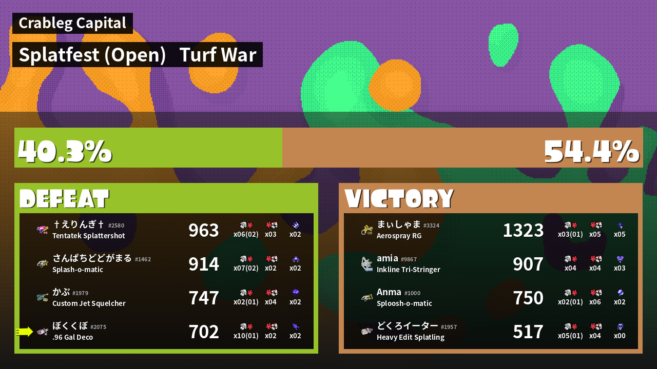 | Medals | #1 Overall Splatter #1 Popular Target #1 Enemy Splatter | ||