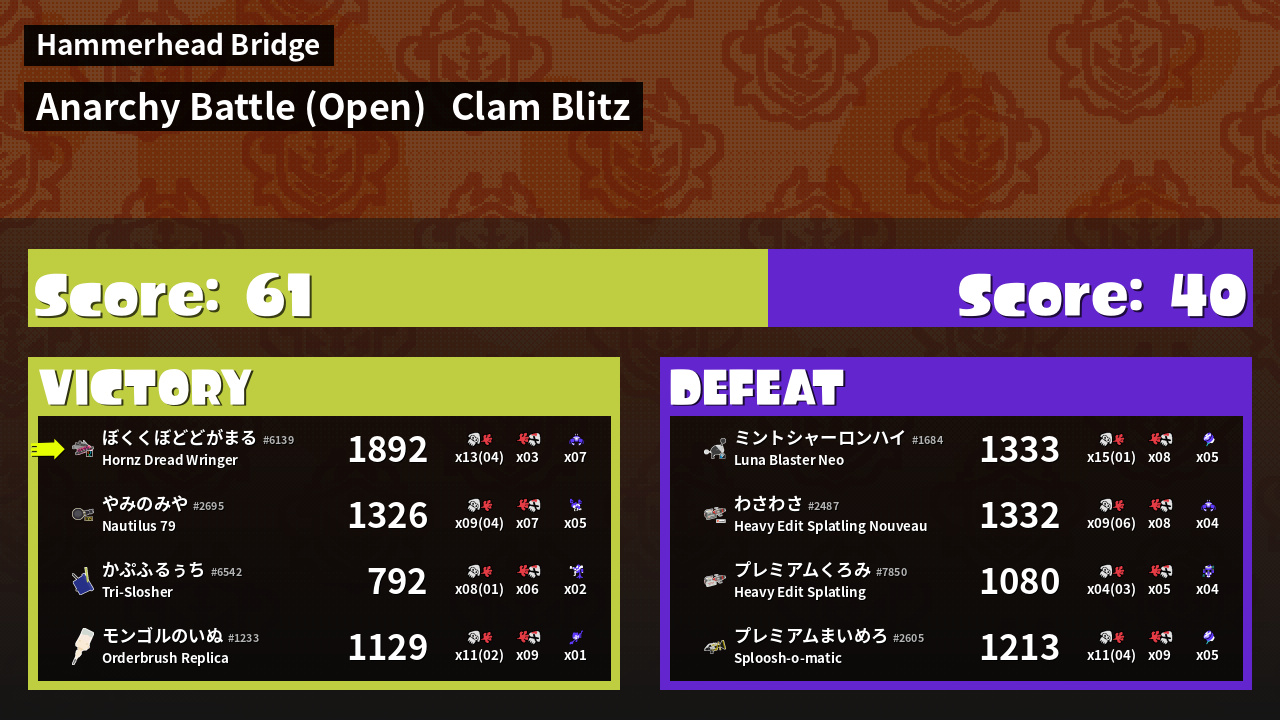 | Mode | Clam Blitz - Anarchy Battle (Open) |
