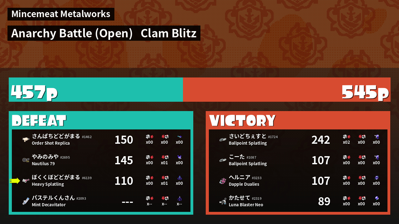 | Mode | Clam Blitz - Anarchy Battle (Open) |