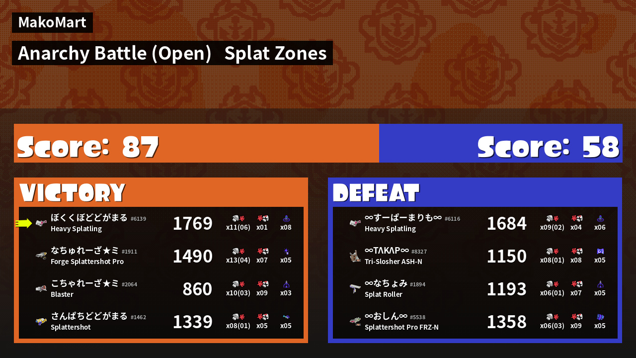 | Mode | Splat Zones - Anarchy Battle (Open) |