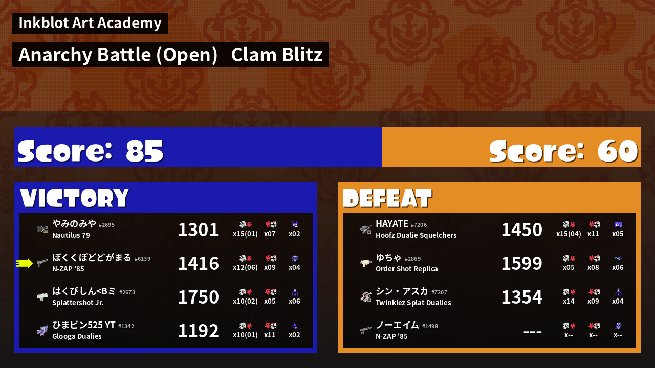 | Mode | Clam Blitz - Anarchy Battle (Open) |