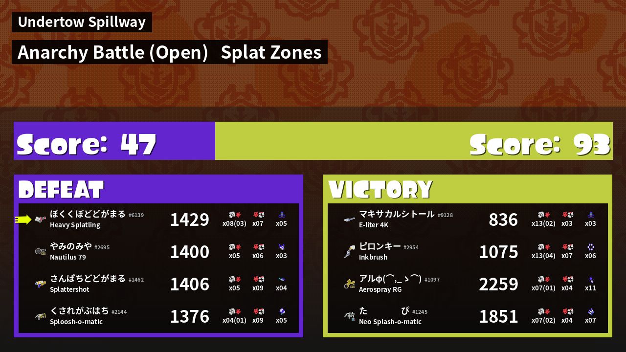 | Mode | Splat Zones - Anarchy Battle (Open) |