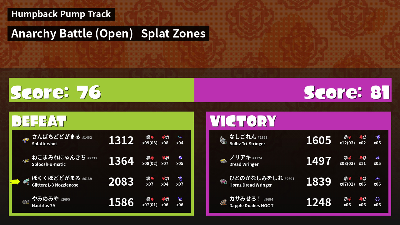 | Mode | Splat Zones - Anarchy Battle (Open) |