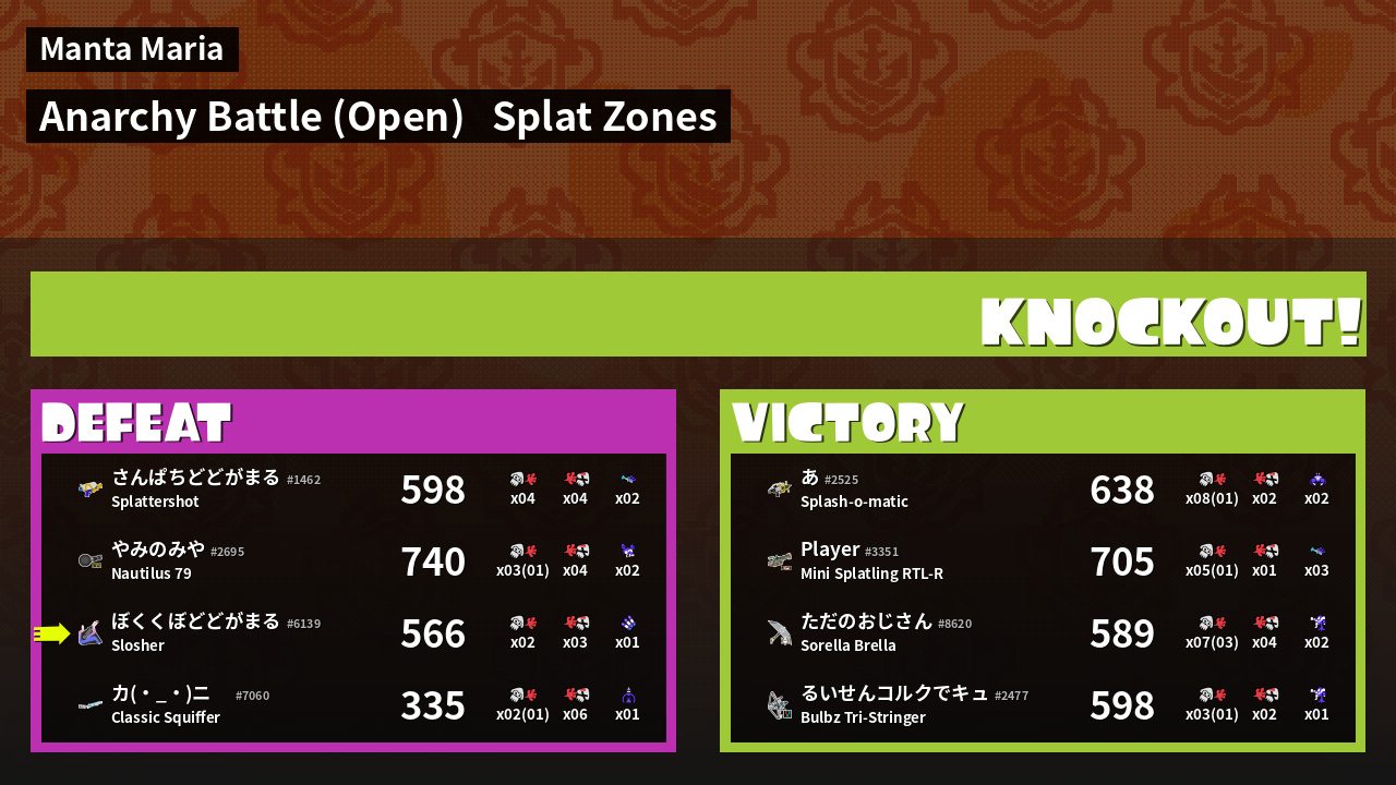 | Mode | Splat Zones - Anarchy Battle (Open) |