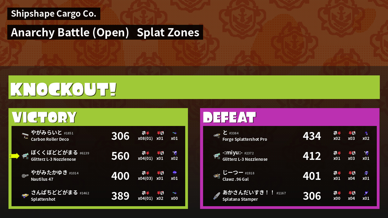 | Mode | Splat Zones - Anarchy Battle (Open) |