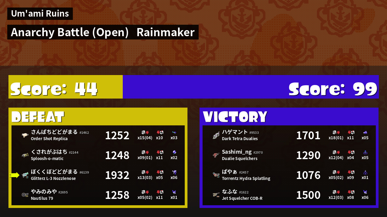 | Mode | Rainmaker - Anarchy Battle (Open) |