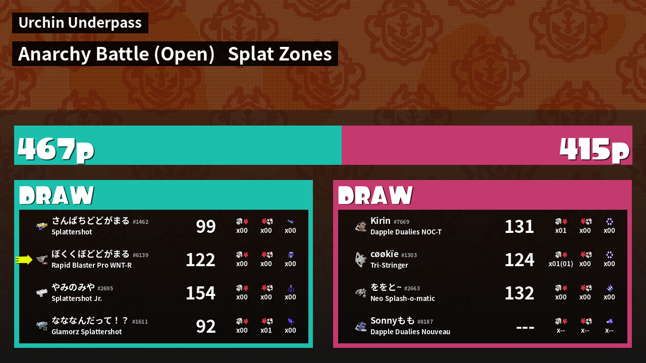 | Mode | Splat Zones - Anarchy Battle (Open) |